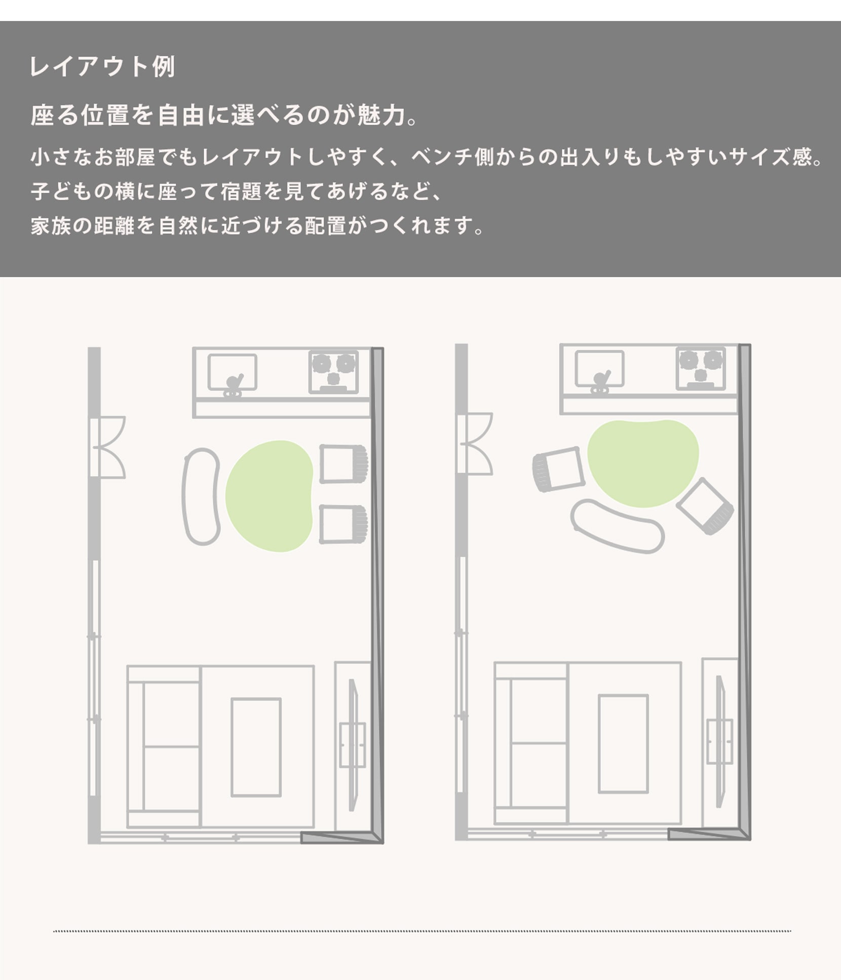 やわらかなカーブと座りやすい高さで、家族の距離を自然と近づけます。